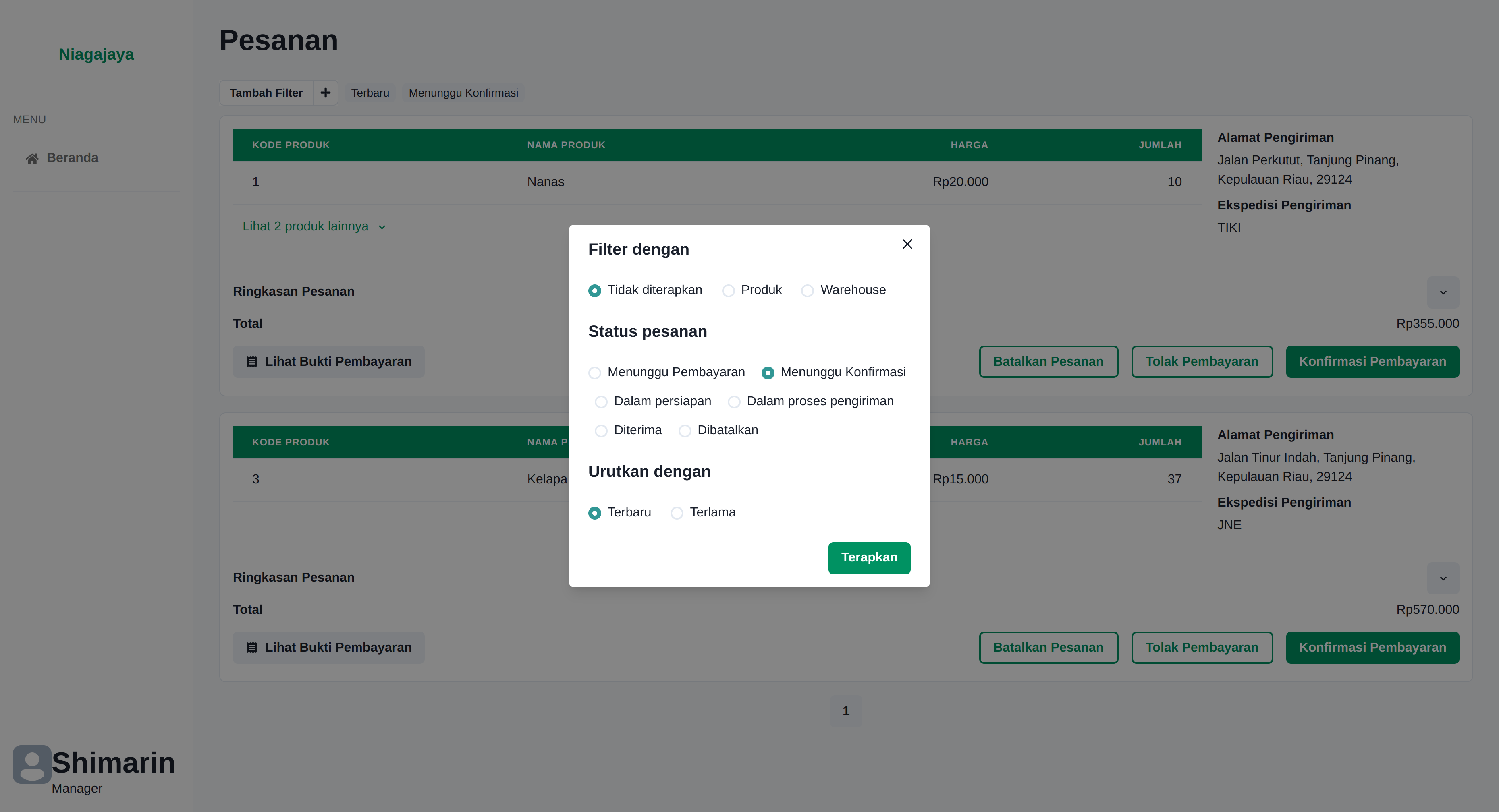 - Warehouse Admin hanya dapat mengakses daftar pesanan warehousenya saja.